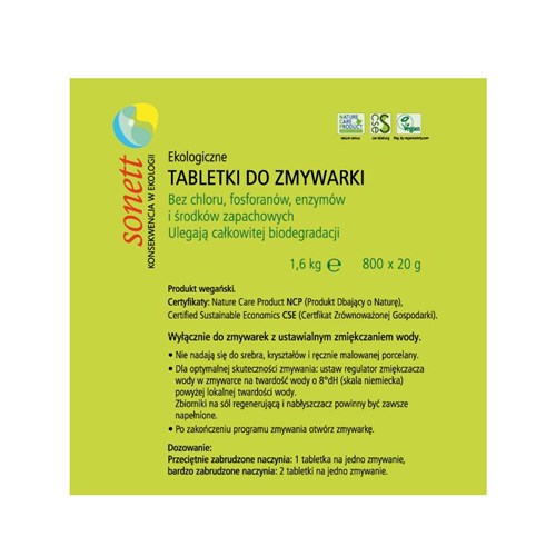 Tabletki do zmywarki Sonett zawierają minerały i składniki organiczne w pełni biodegradowalne. Nie zawierają enzymów, agresywnych chlorowych środków wybielających, fosforanów i dodatków zapachowych. Są wykonane w 100% z surowców mineralnych i roślinnych.
