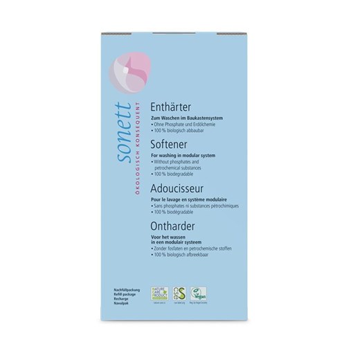 Dodawanie zmiękczacza osobno – w zależności od stopnia twardości wody na danym obszarze – gwarantuje najbardziej ekonomiczne wykorzystanie detergentu. Tak jak w przypadku samych detergentów, Sonett używa do produkcji Środka do zmiękczania wody wyłącznie składników absolutnie niezbędnych i całkowicie odżegnuje się od wykorzystywania wypełniaczy, fosforanów i innych petrochemicznych substancji zmiękczających, takich jak fosfoniany, NTA (nitrylooctany) i EDTA (kwas etylenodiaminotetraoctowy).