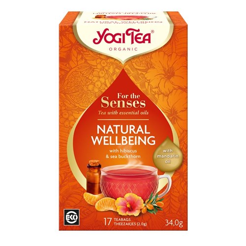 YOGI TEA® NATURAL WELLBEING z wysokiej jakości mandarynkowym olejkiem eterycznym, owocowym rokitnikiem i hibiskusem ożywia zmysły i sprawia, że czujemy się gotowi poradzić sobie z codziennymi wyzwaniami.